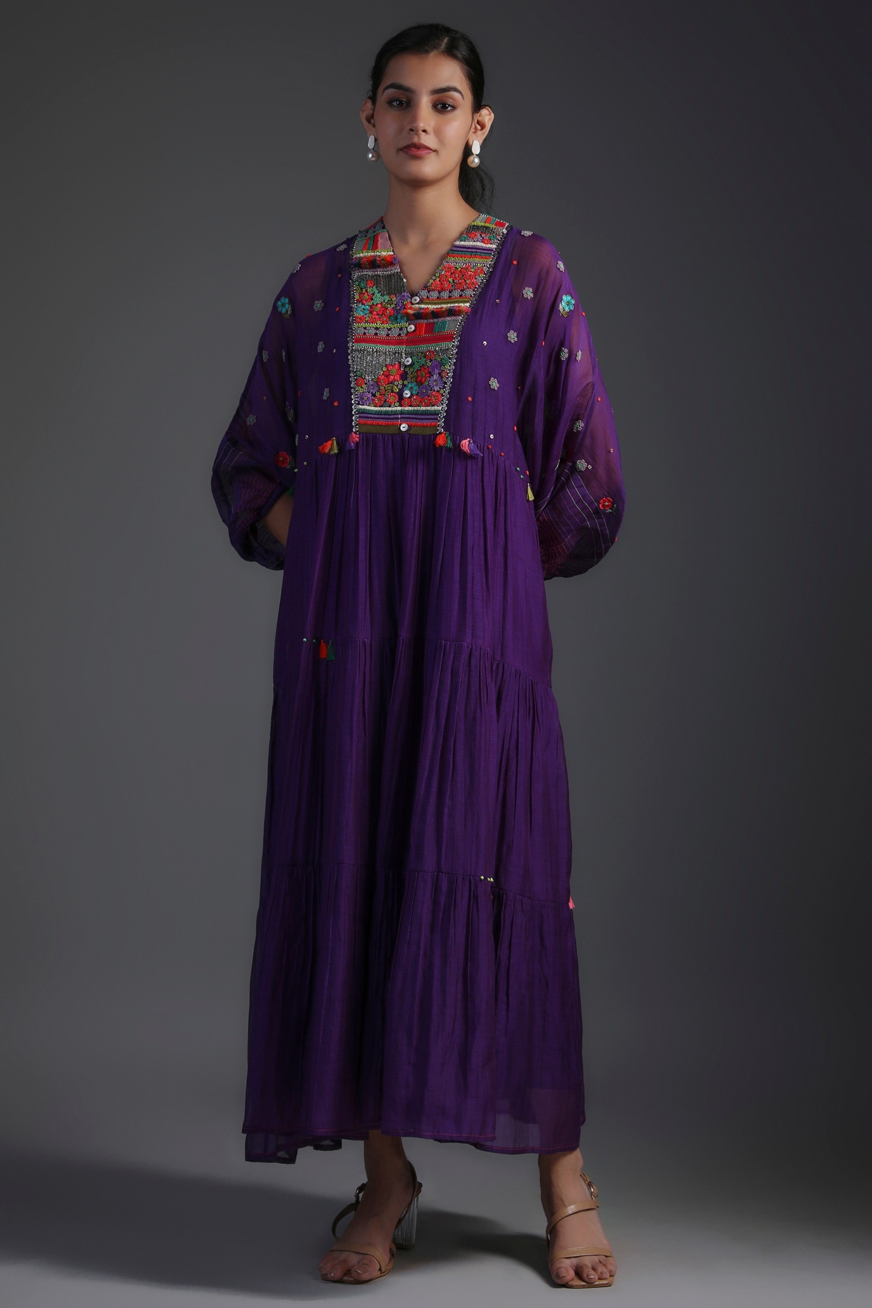 Purple Fine Chanderi Hand Embroidered Dress by Half Full Curve at