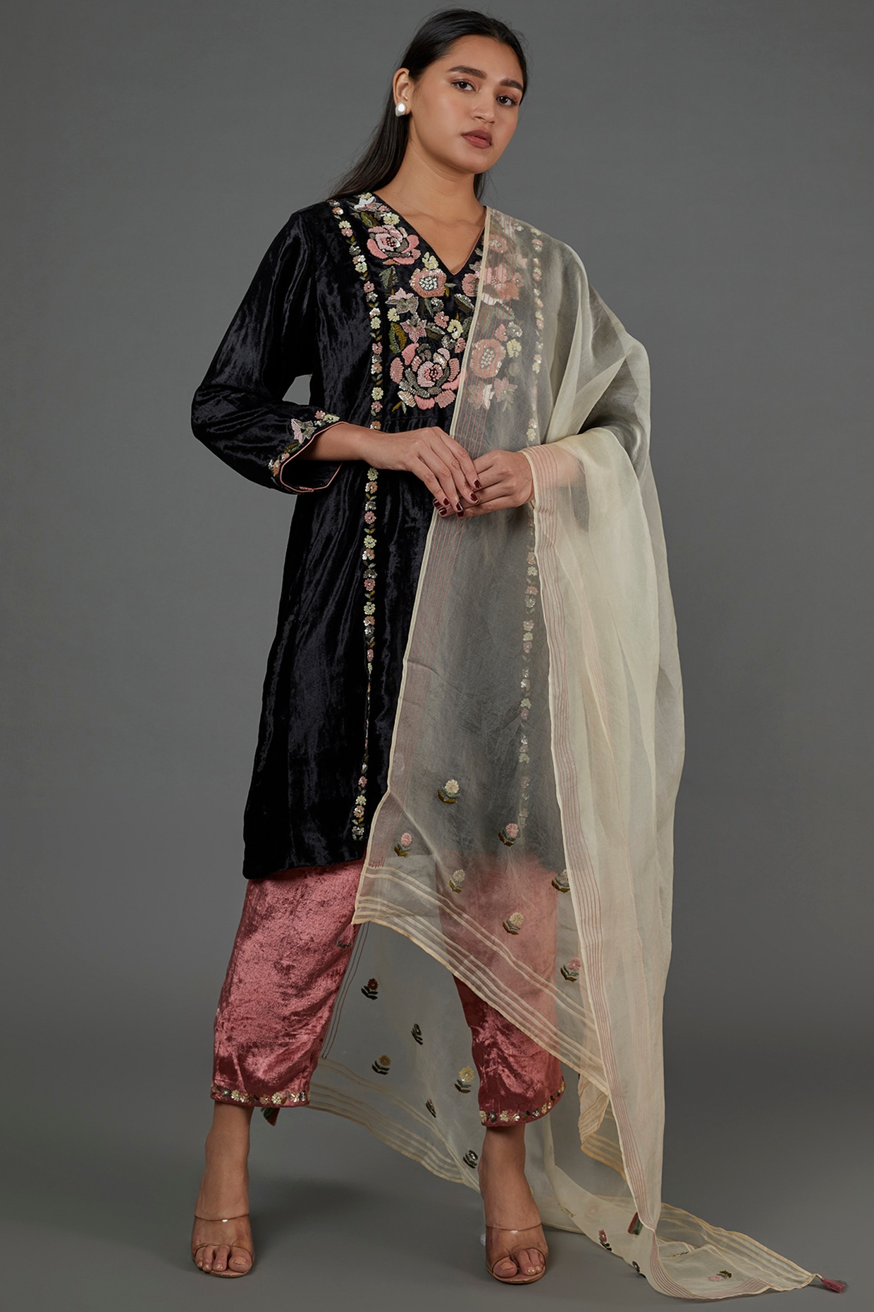 Green Silk Velvet Hand Embroidered Kurta Set by Half Full Curve at