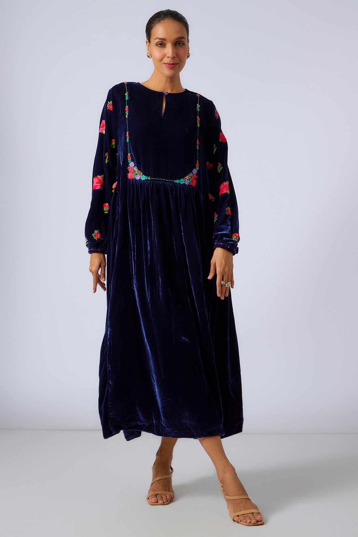 Blue Silk Velvet Hand Embroidered Midi Dress by Half Full Curve at