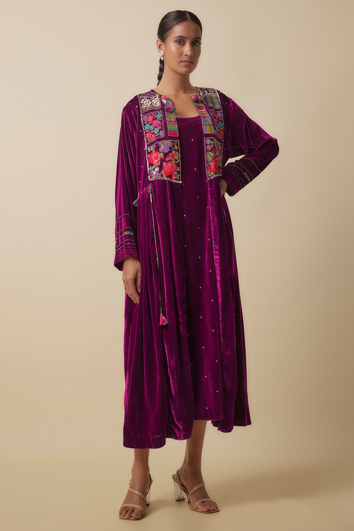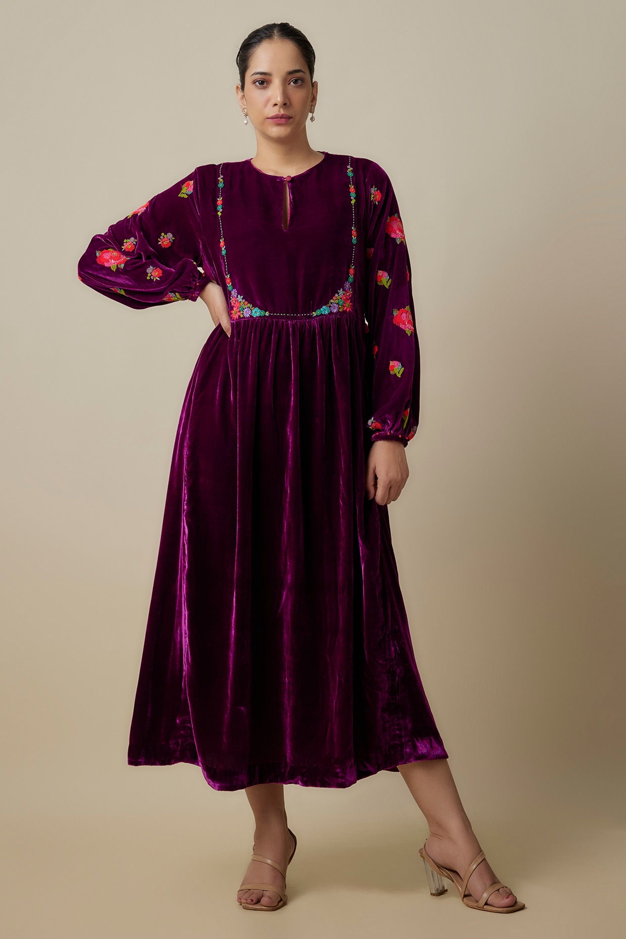 Wine Silk Velvet Hand Embroidered Midi Dress by Half Full Curve at