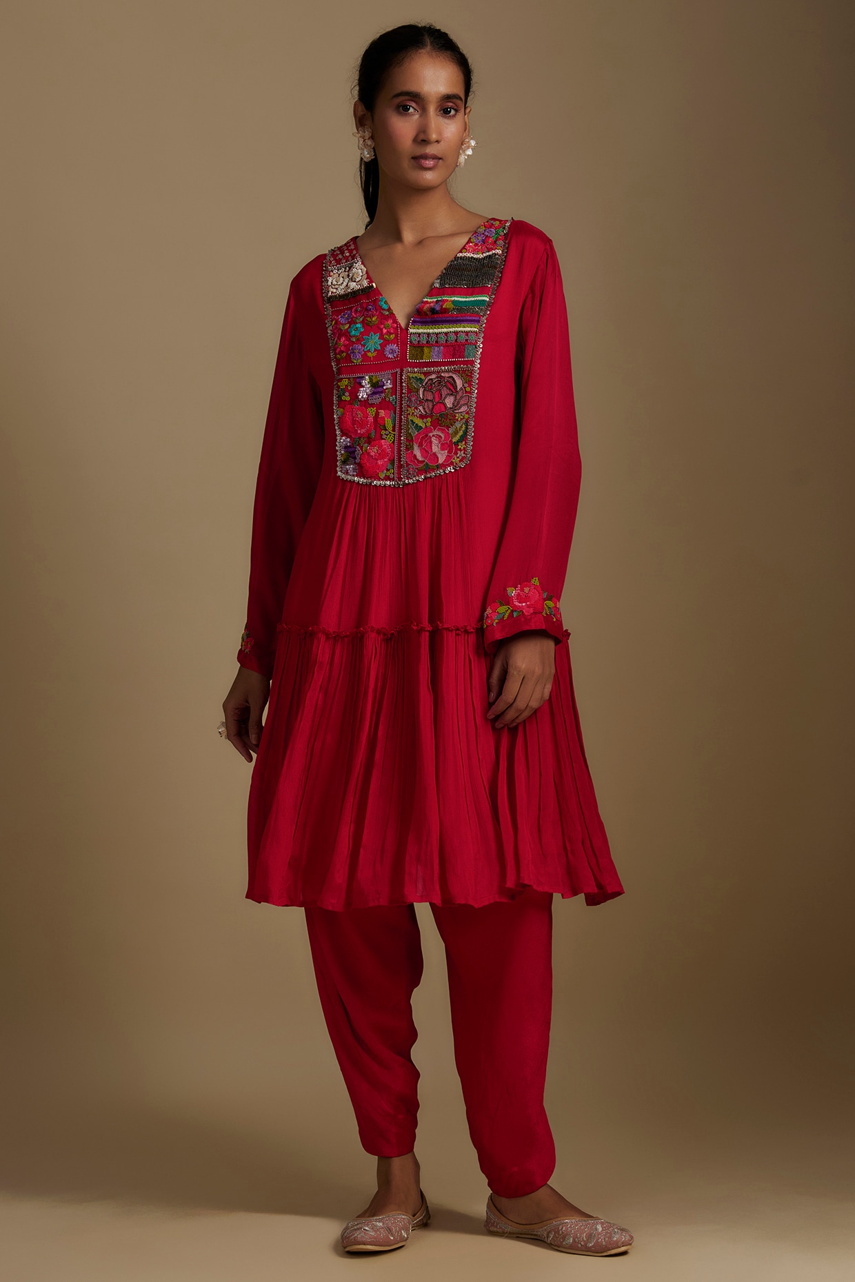 Red Pure Silk Hand Embroidered Kurta Set by Half Full Curve at Pernia's