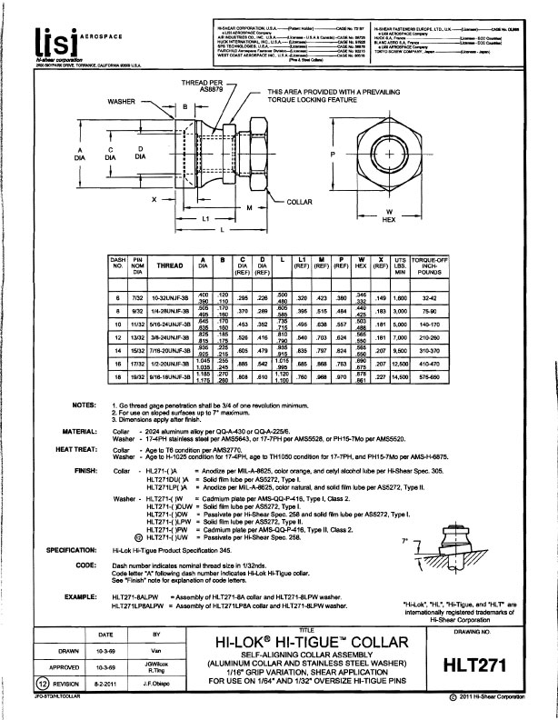 HiLok / HiTigue Fasteners HLT271 HiTigue Collar Shear Application
