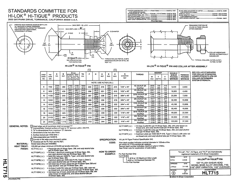 HiLok / HiTigue Fasteners HLT715 HiTigue Pin Flush Shear Head