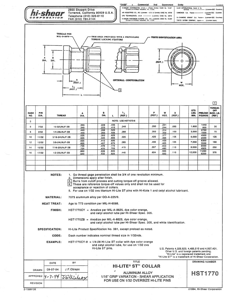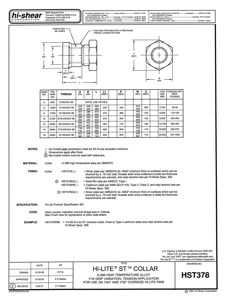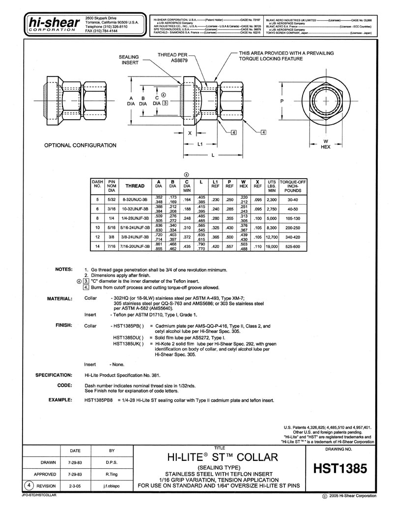 HiShear Fasteners HiLite Collars HST1375 Special Application