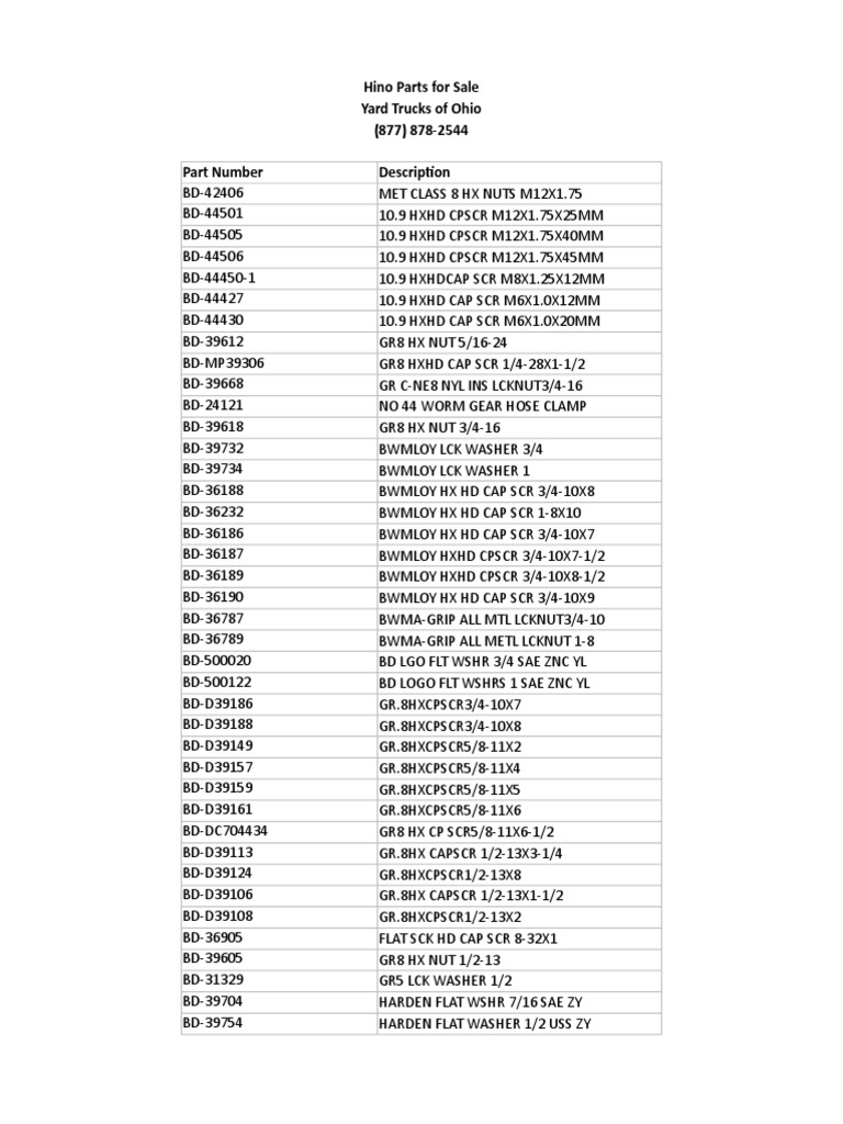 Hino Parts Catalog Extensive Listing of Truck Parts including Nuts