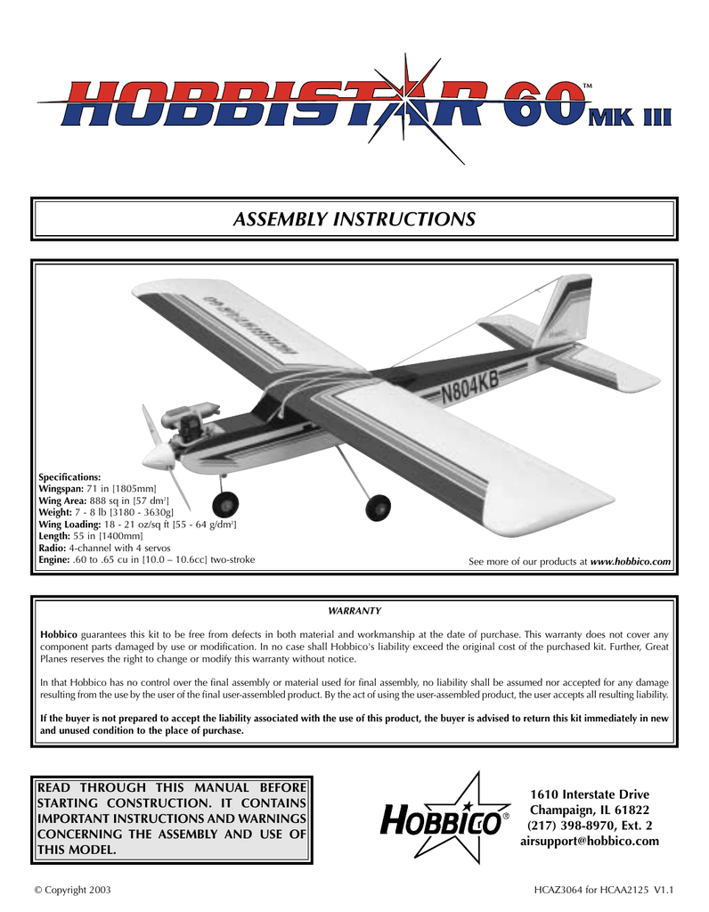 Hobbico Hobbistar 60 MK III Assembly Instructions Manual Manualzz