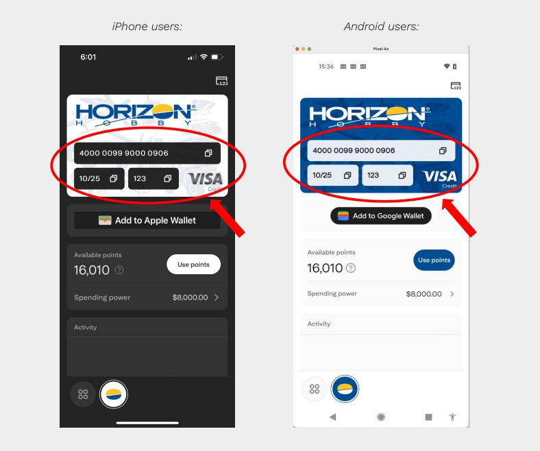 How do I use my virtual Horizon Hobby card ? Horizon Hobby