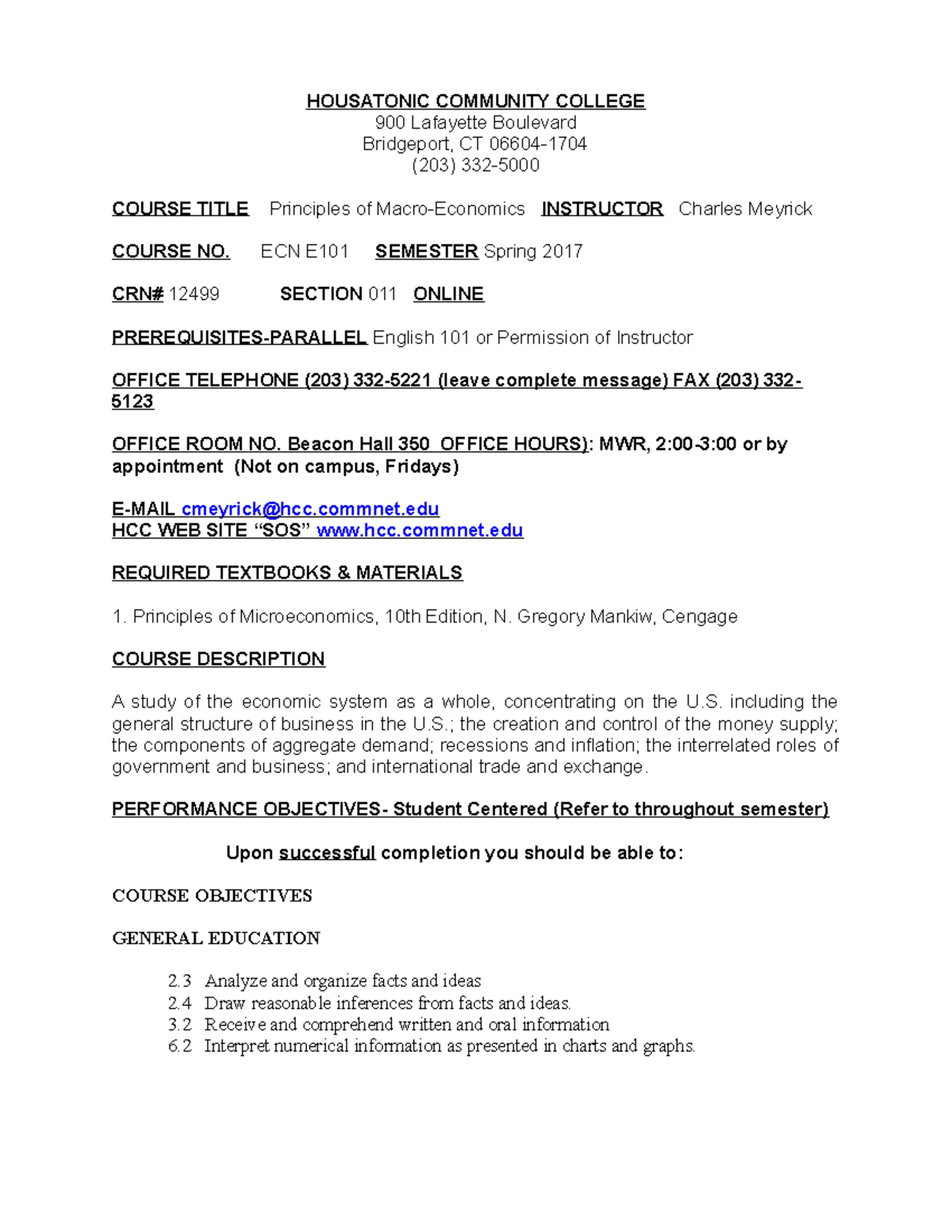 Syllabus ECN 101 Fall 2023 CRN 12499 HOUSATONIC COMMUNITY COLLEGE 900