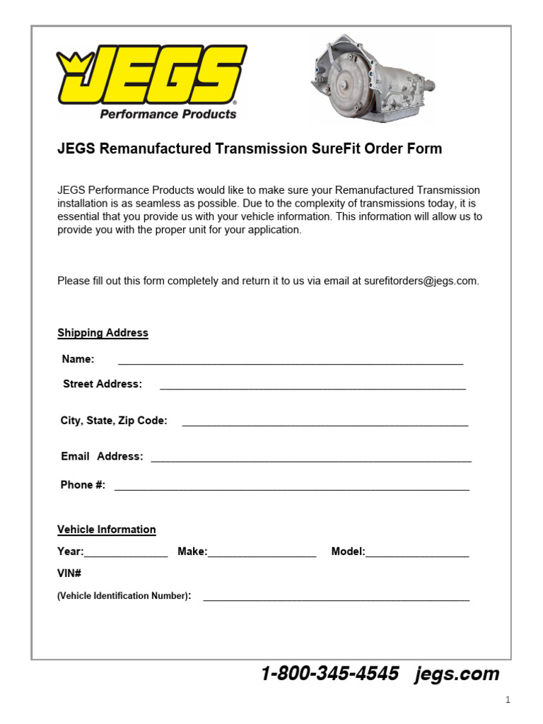 Jegs Remanufactured Transmission Order Form PDF
