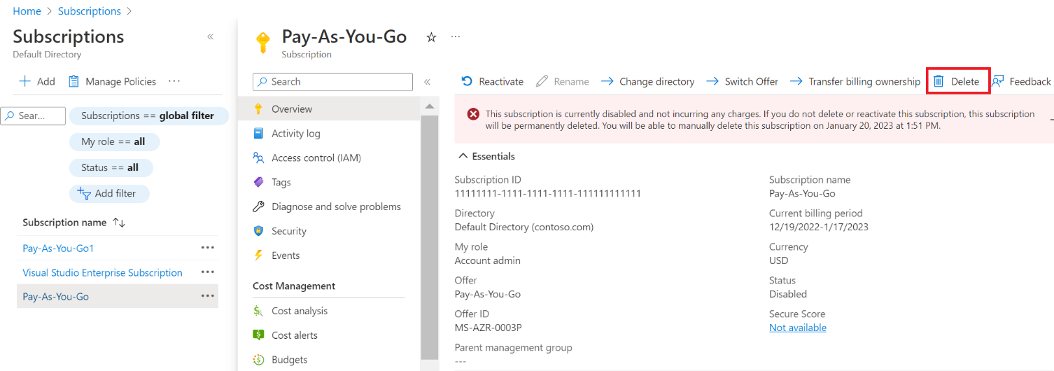 Microsoft Azure Disable or Cancel an Azure Subscription