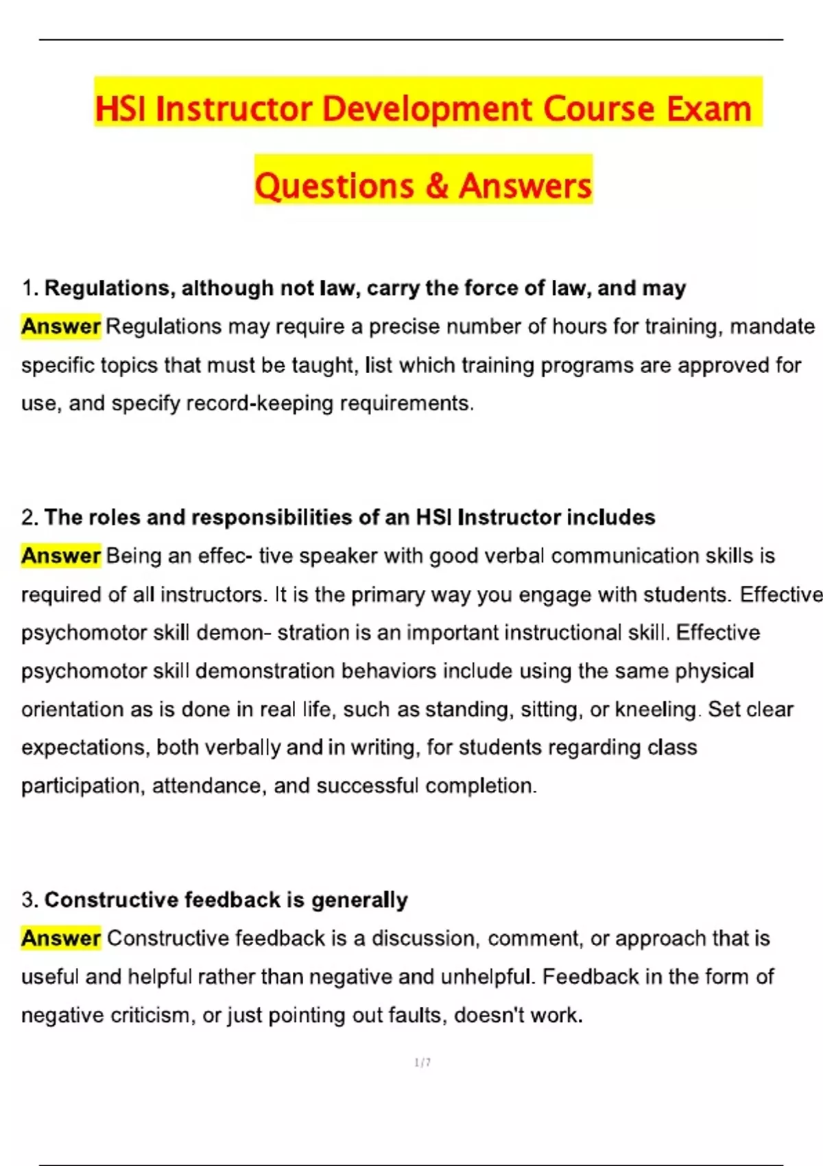 HSI Instructor Development Course Exam Questions and Answers HSI