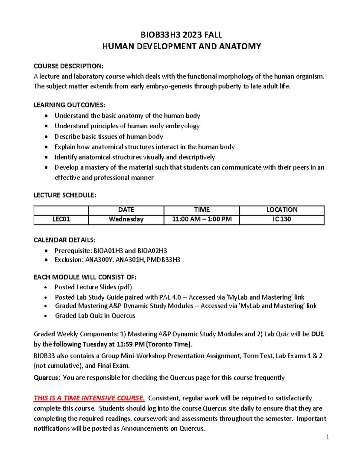 BIOB33 H3F Syllabus 2023 Fall BIOB33H3 2023 FALL HUMAN DEVELOPMENT