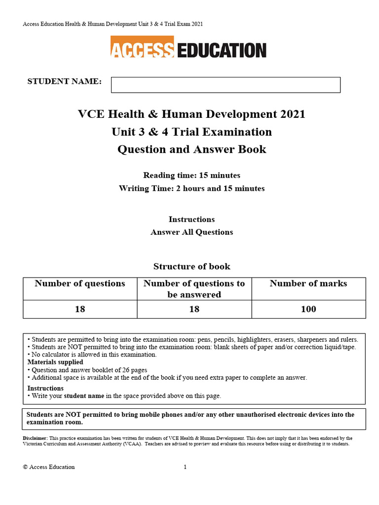 Access Ed HHD U3&4 Trial Exam 2021 PDF Business