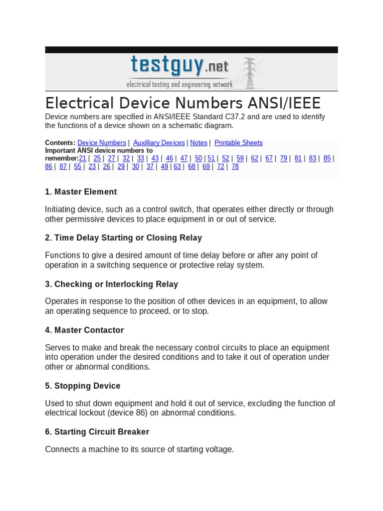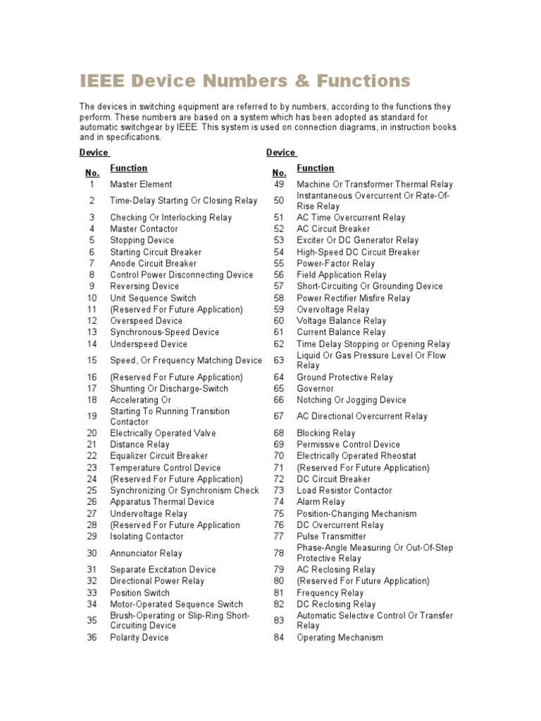 Electrical Device Numbers ANSI/IEEE Standards Guide PDF Relay Switch