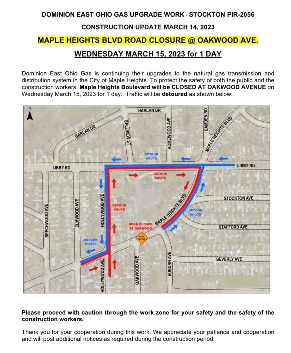 CONSTRUCTION NOTICE Detour 3/15/23 Maple Heights Blvd at Oakwood