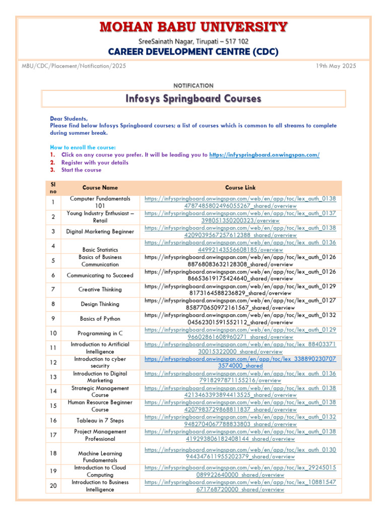 Infosys Springboard Courses Notification PDF Computing