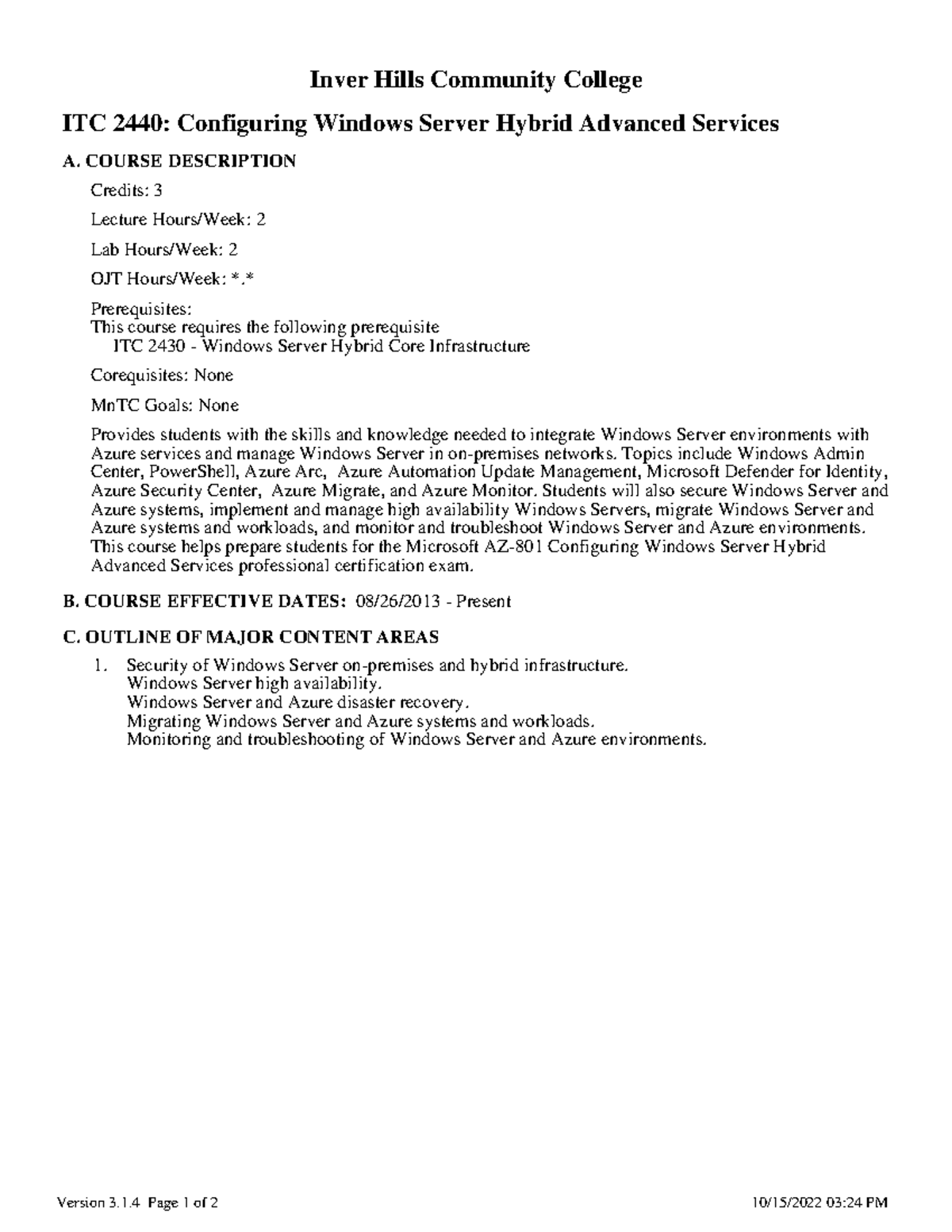 Course Outline Inver Hills Community College ITC 2440 Configuring