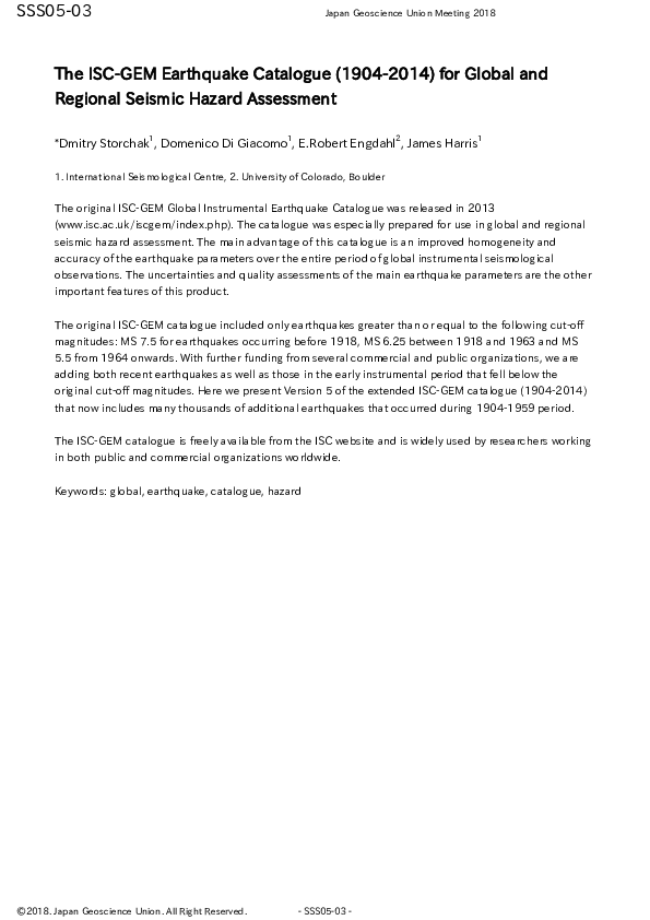 (PDF) The ISCGEM Earthquake Catalogue (19042014) status after the