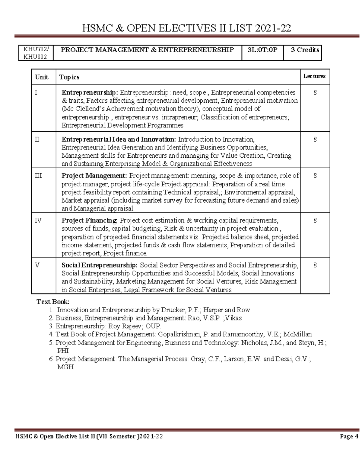 Project Management Syllabus HSMC & OPEN ELECTIVES II LIST 2021 HSMC