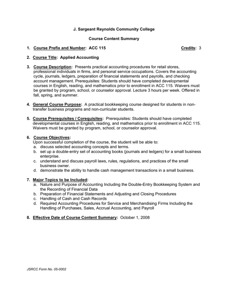 J. Sargeant Reynolds Community College Course Content Summary Credits