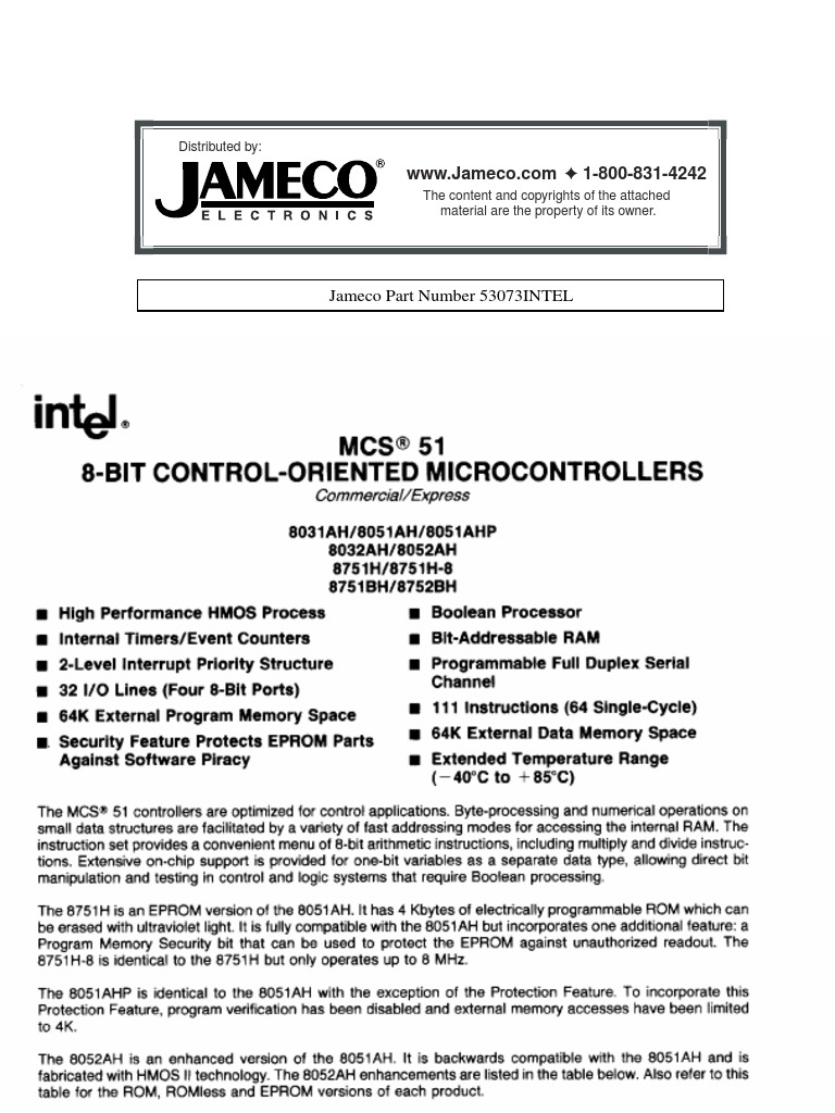 Jameco Part Number 53073INTEL Distributed by PDF Computer Data