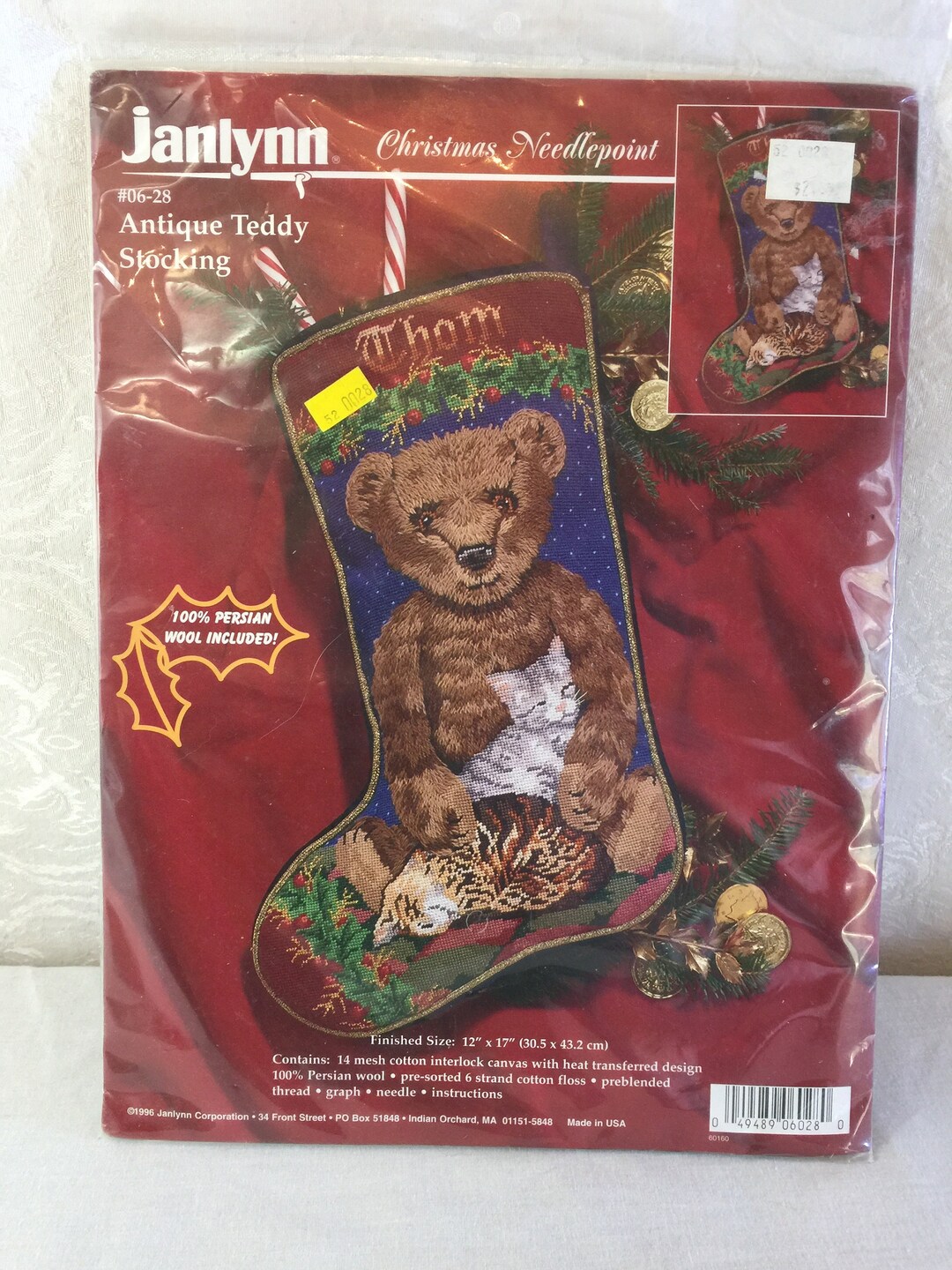 RARE 1996 "antique Teddy Stocking" Janlynn Wool Needlepoint Christmas