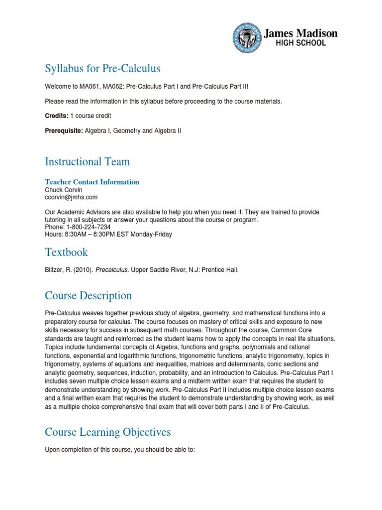 Pre Calculus Jmhs Syllabus PDF Precalculus Function (Mathematics)
