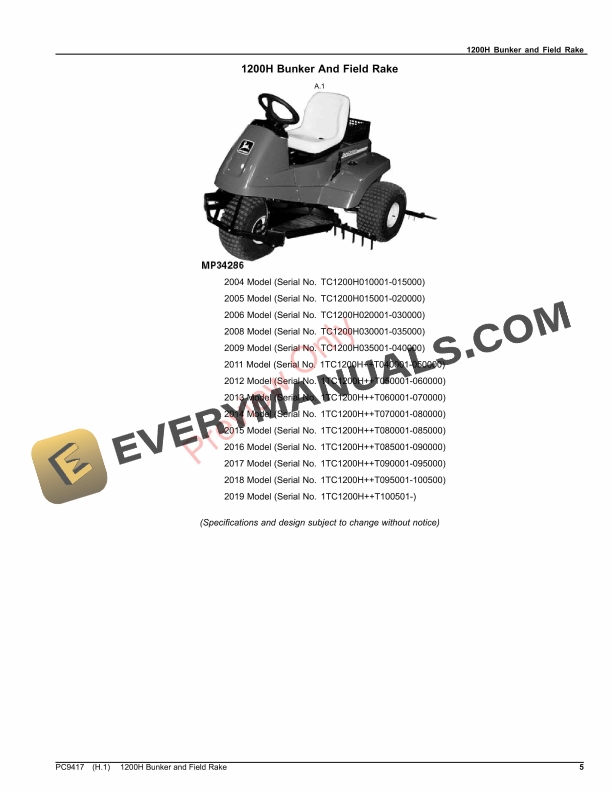 John Deere 1200 HYDRO BUNKER AND FIELD RAKE Parts Catalog PC9417 09OCT23