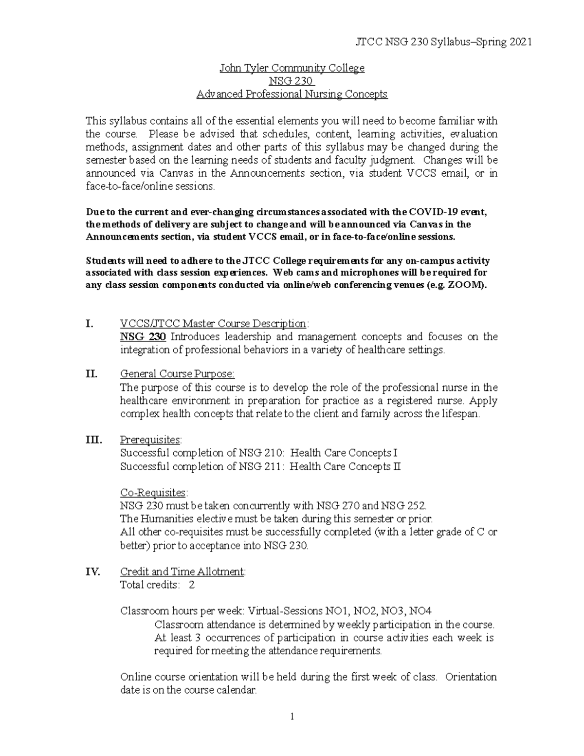 Spring 2021 NSG 230Syllabus Final edit1 John Tyler Community College