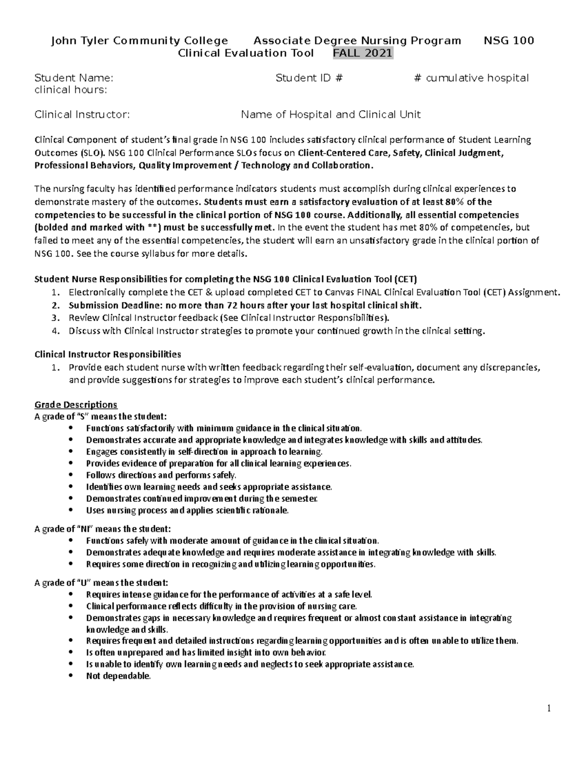 NSG 100 Final Clinical Evaluation Tool1 John Tyler Community College