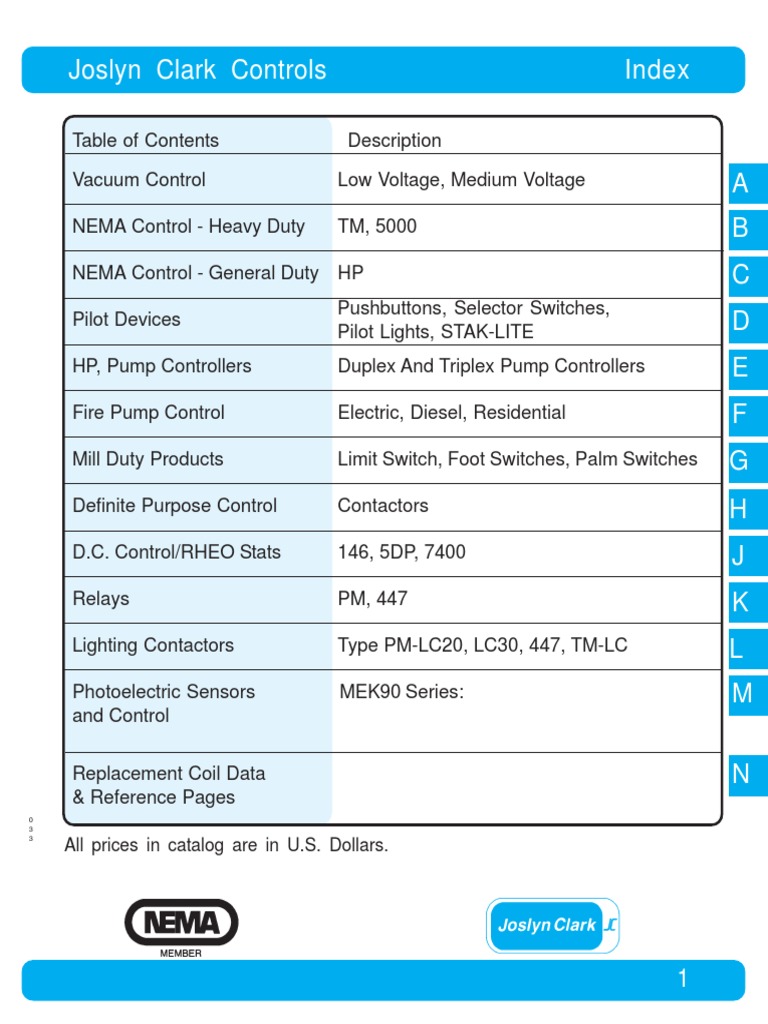 Joslyn Clark Controls Index All Prices in Catalog Are in U.S. Dollars