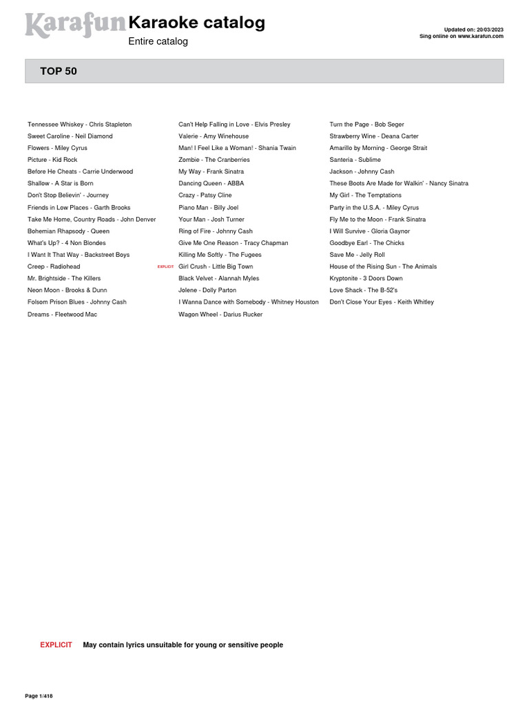 Karaoke Catalog 1000 Most Popular Songs PDF Country Music