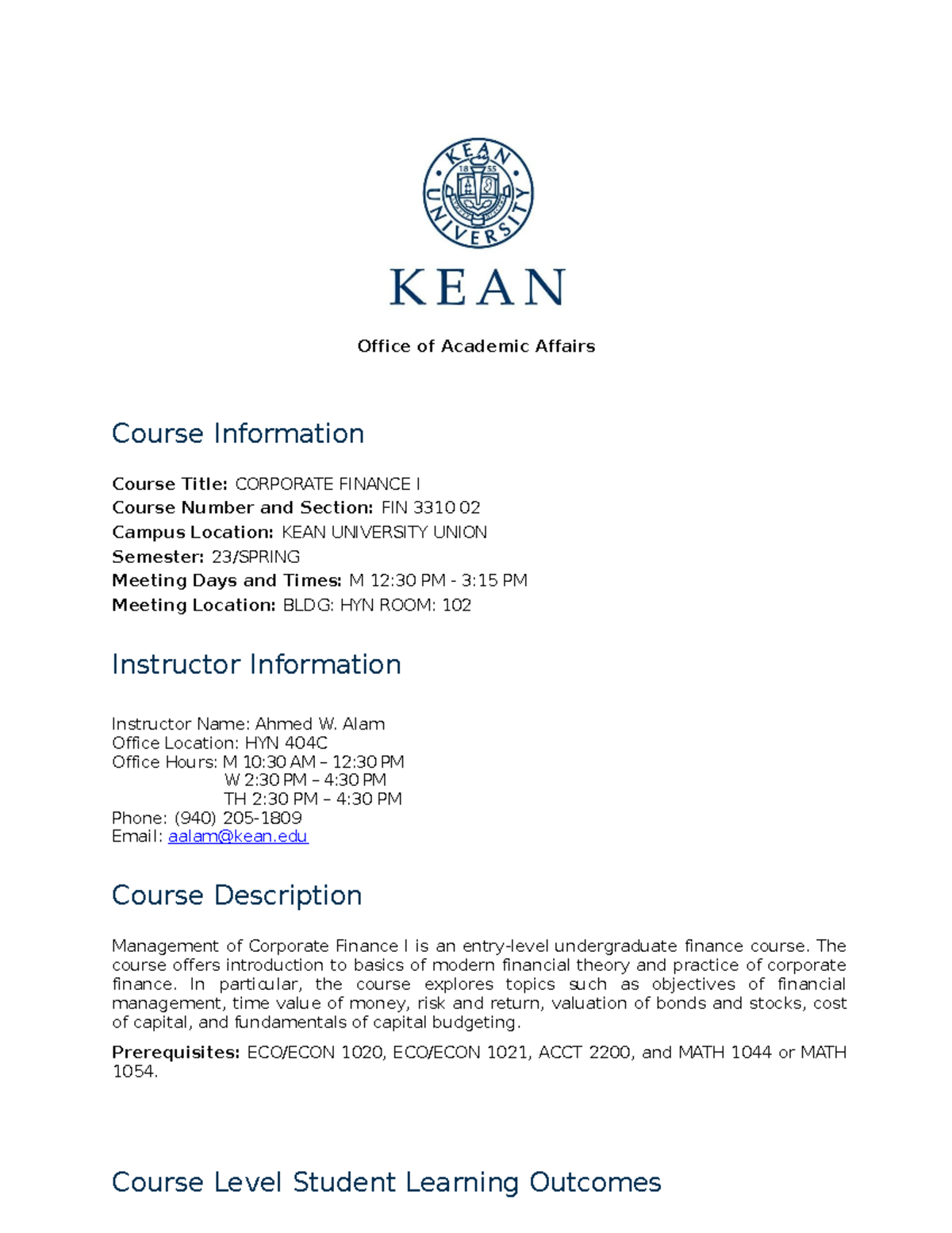 23 SpringFIN331002 Corporate FinanceI Office of Academic