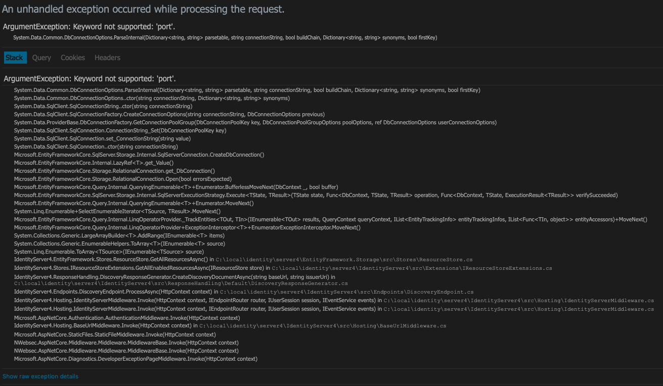 "Keyword not supported 'port'." & "Unable to retrieve document from