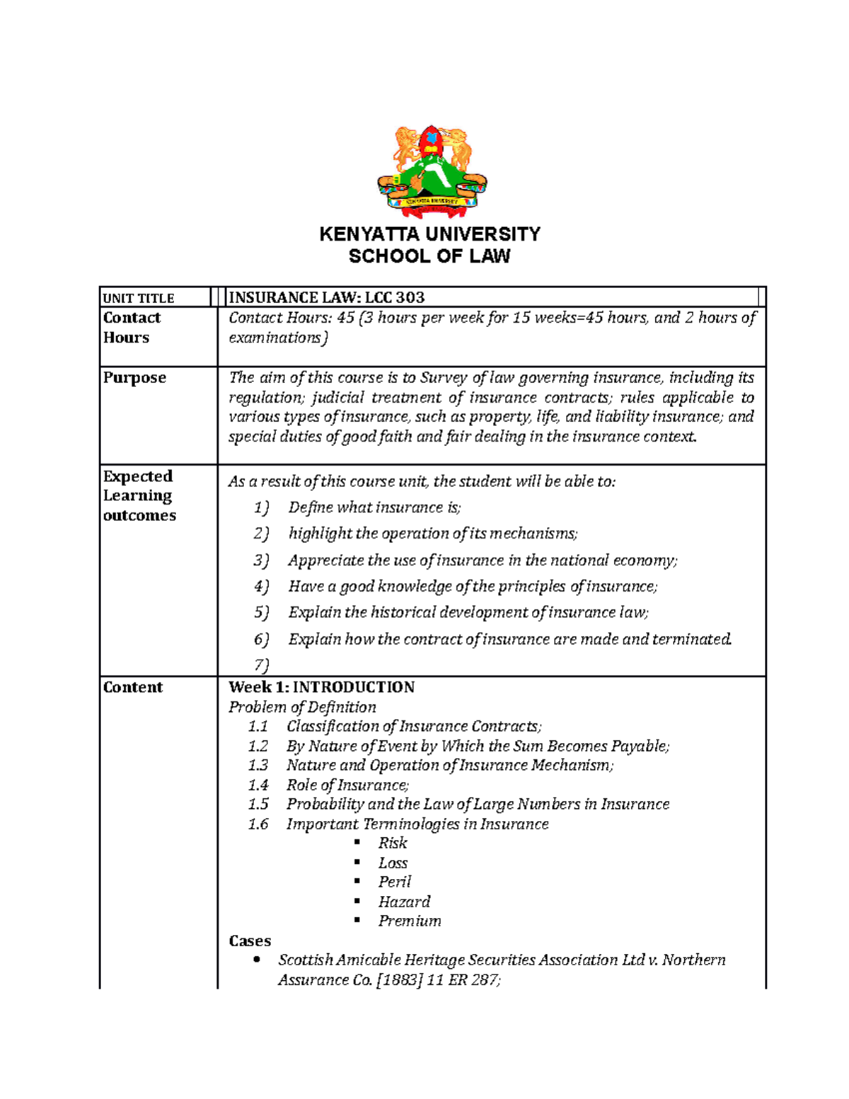 KU Insurance CUE Sylabus KENYATTA UNIVERSITY SCHOOL OF LAW UNIT TITLE
