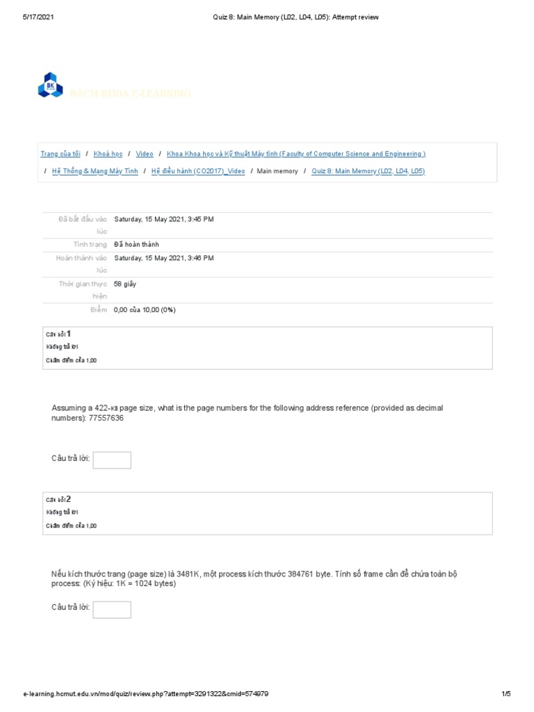 Quiz 8 Main Memory L02 L04 L05 Attempt Review PDF