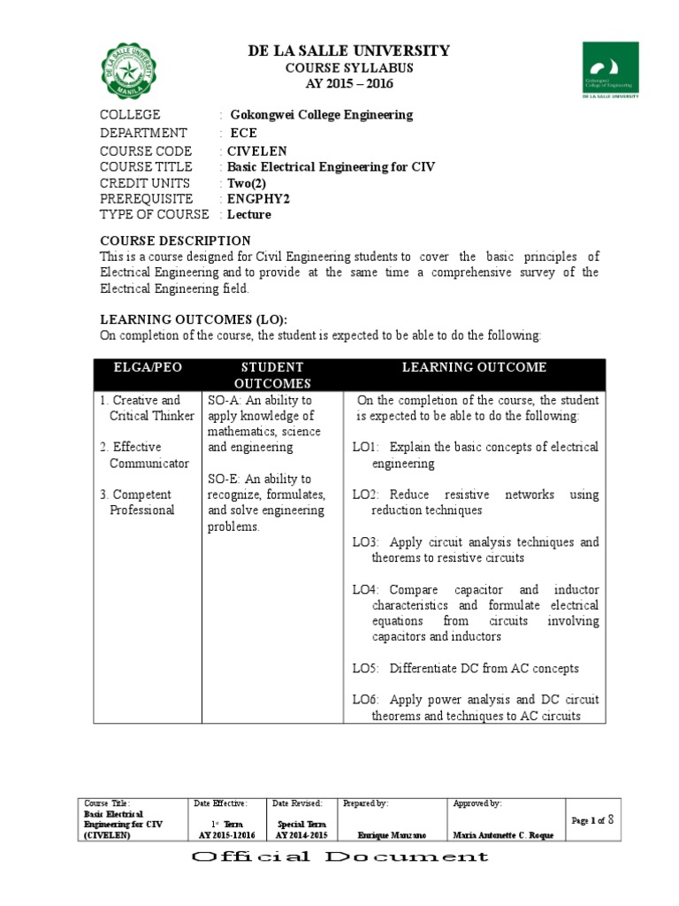 De La Salle University Course Syllabus AY 2015 2016 PDF Ac Power