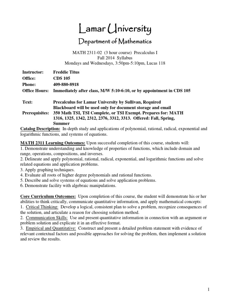 Lamar University Department Of Mathematics Course Catalog