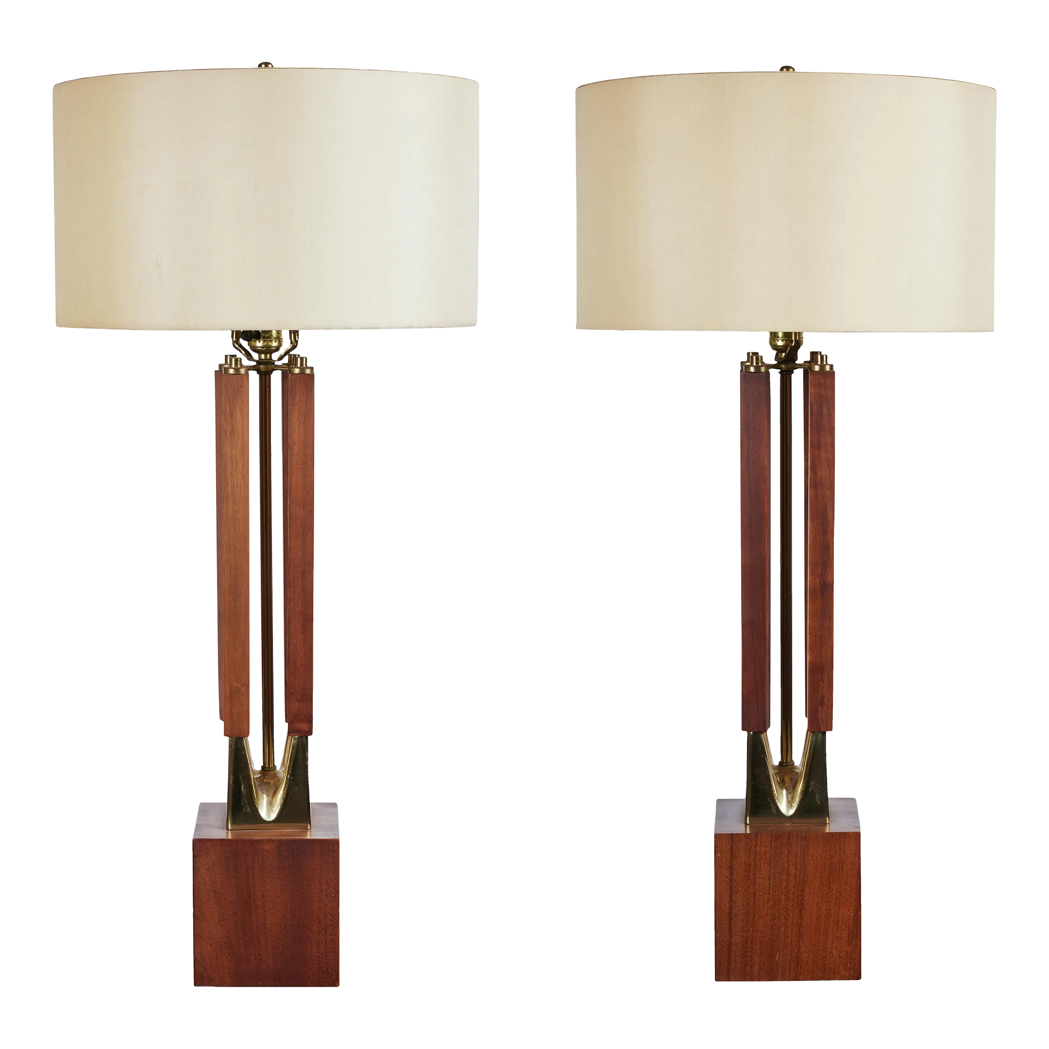 Pair of Walnut and Brass Table Lamps by Laurel Lamp Company, 1960's For