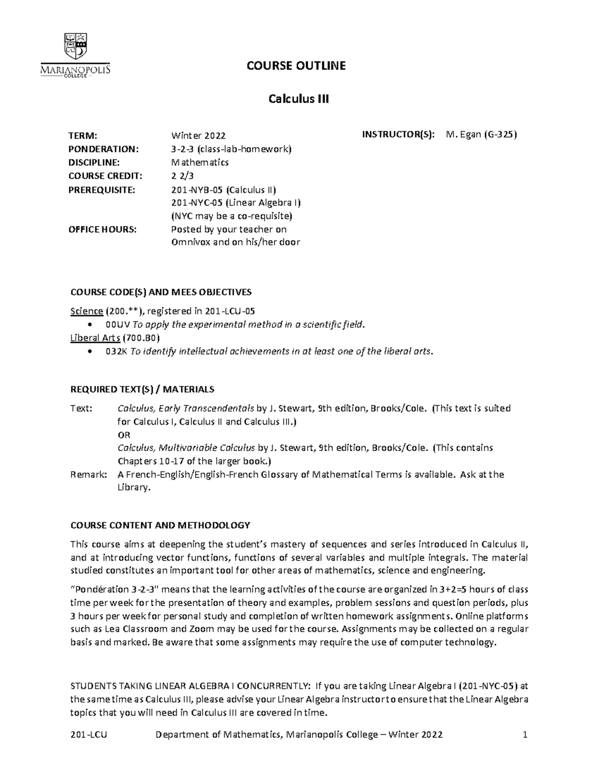 W22 201LCU Calculus III Science COURSE OUTLINE Calculus III COURSE