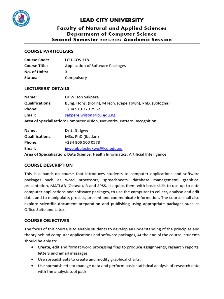 LCUCOS 118 Course Content 2024 PDF Databases Application Software