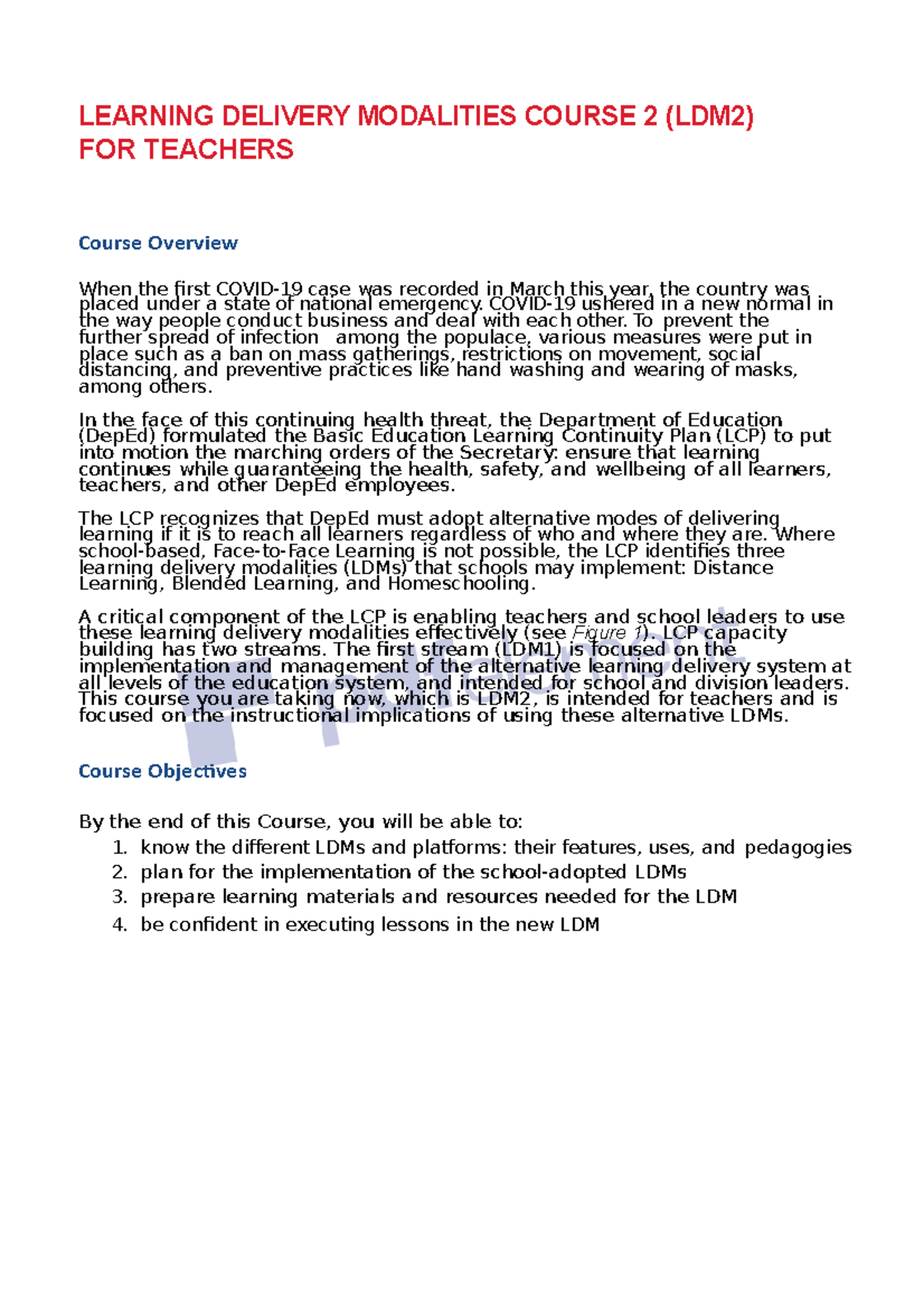 L1A1 LDMCourseOverview LEARNING DELIVERY MODALITIES COURSE 2 (LDM2