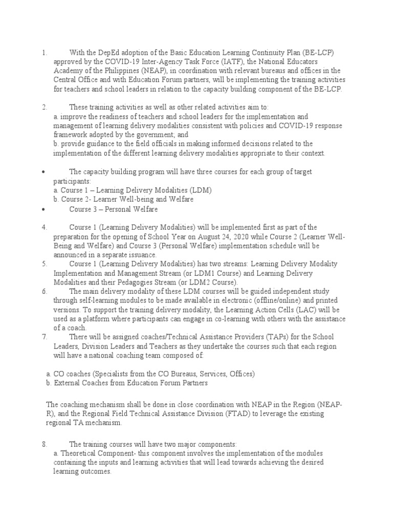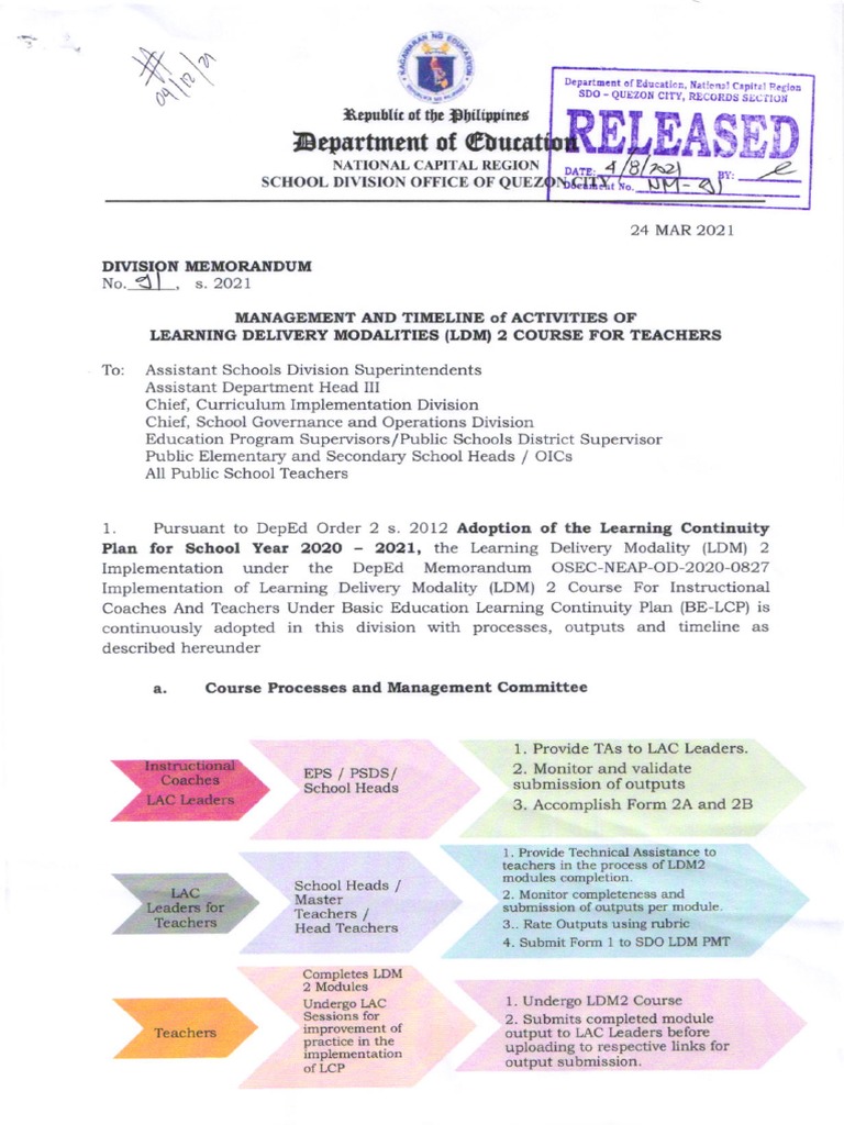 MANAGEMENT AND TIMELINE of ACTIVITIES OF LEARNING DELIVERY MODALITIES
