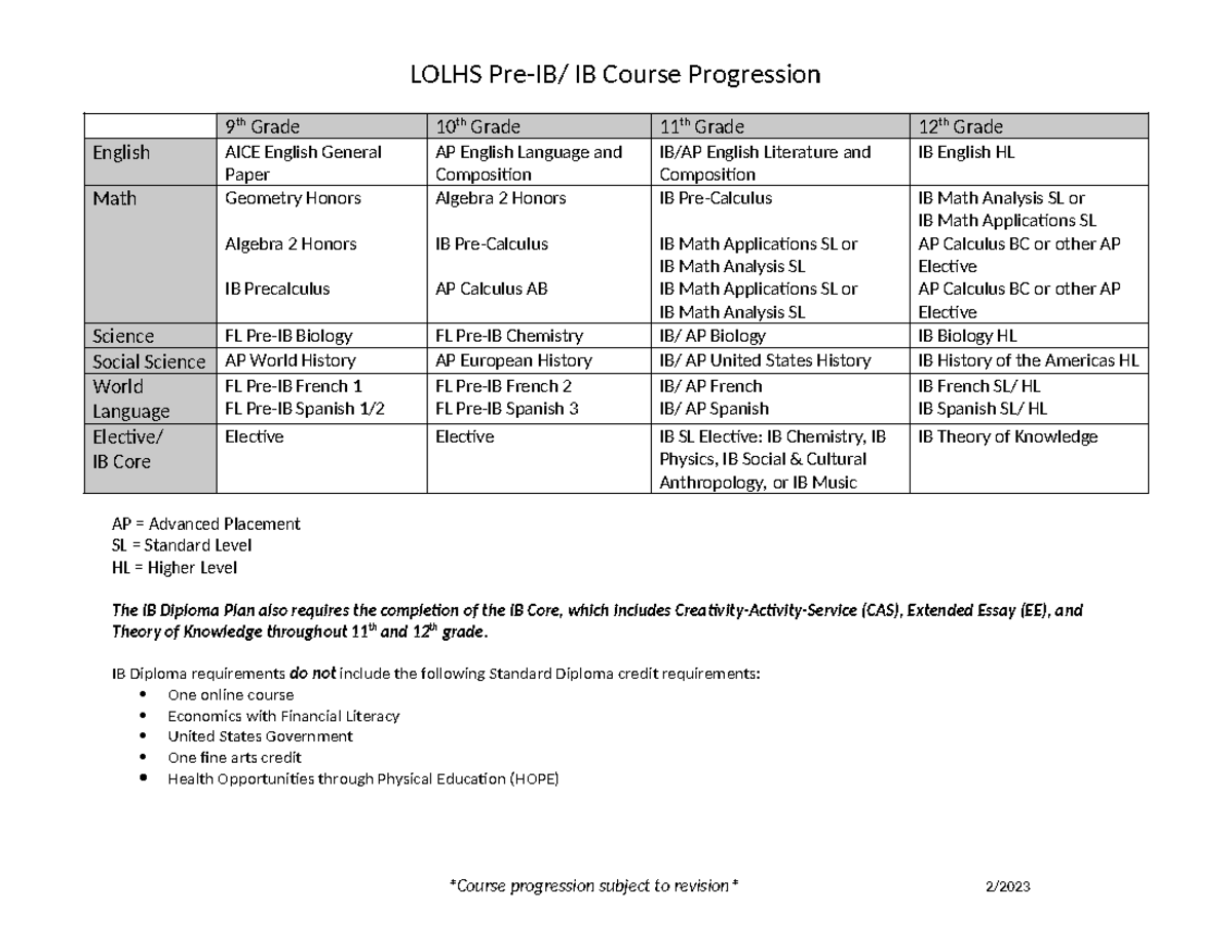 Lolhs IB Course Progression LOLHS PreIB/ IB Course Progression 9 th