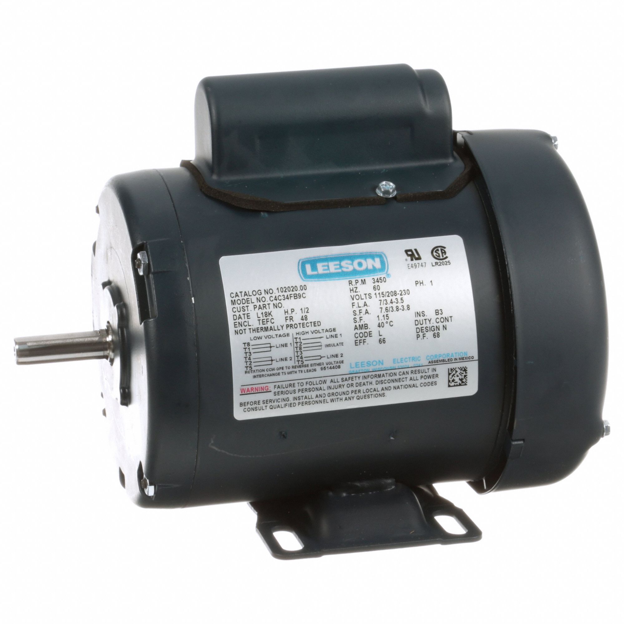 LEESON General Purpose Motor, 0.50 HP, 1 Ph, 60 Hz, 115/208230 V, 1800