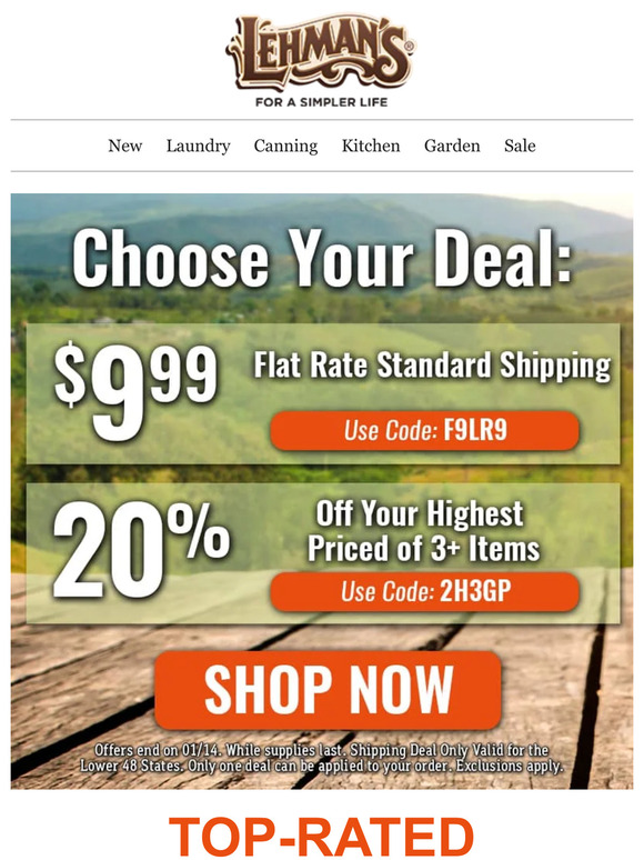 Lehman's Choose Your Deal! Flat Rate Shipping, or 20 Off, Your Choice