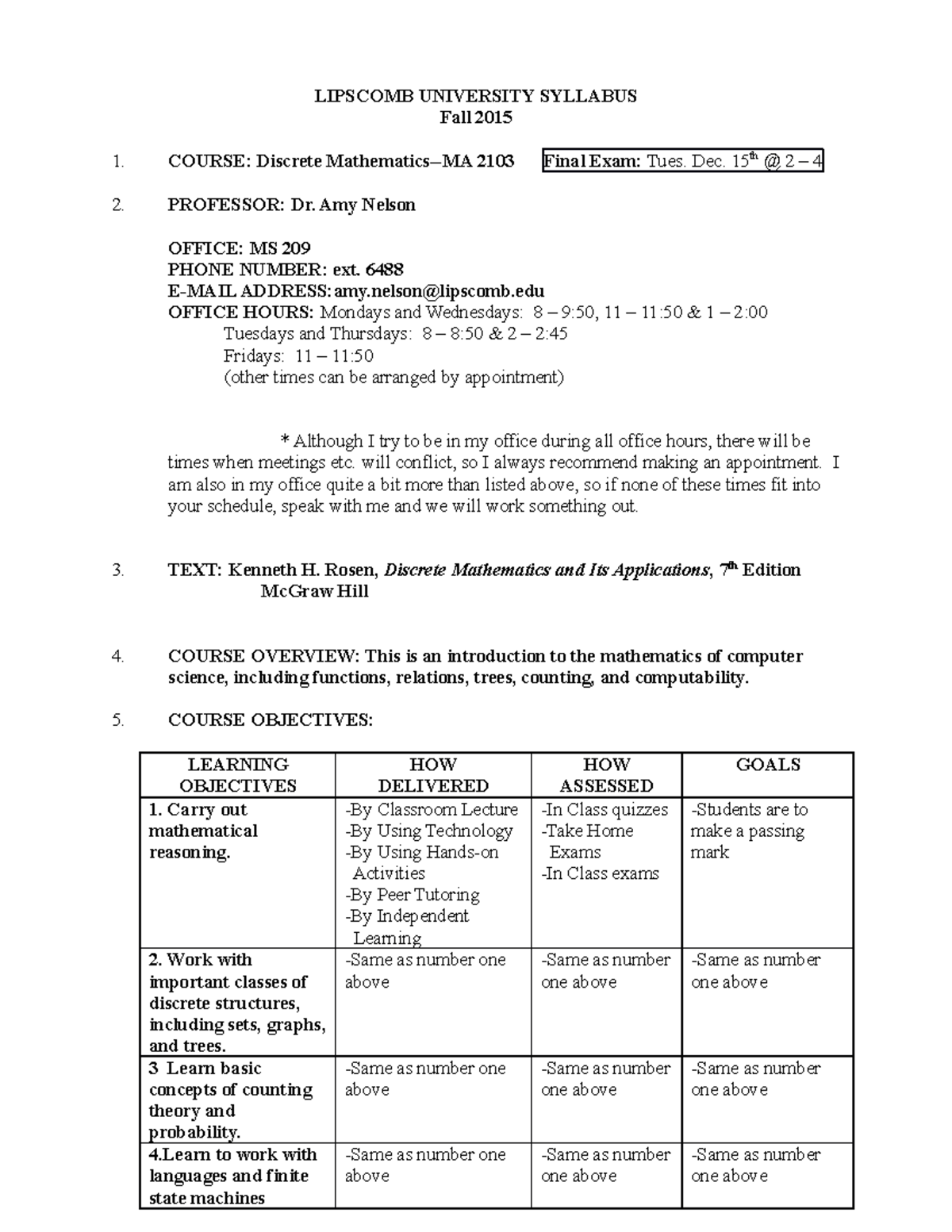 Syllabus for the course UNIVERSITY SYLLABUS Fall 2015 1