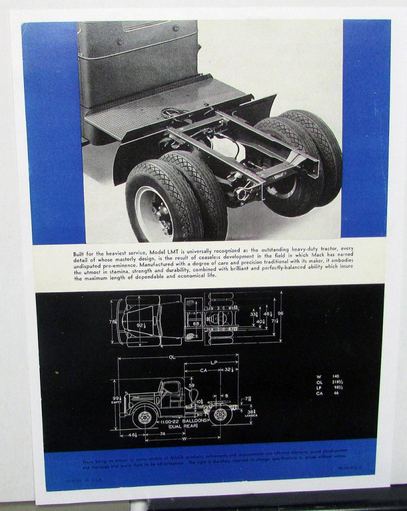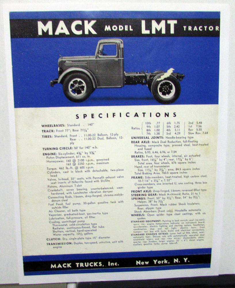 1941 Mack Truck Dealer LMT Tractor Specifications Data Sheet 2 Sided