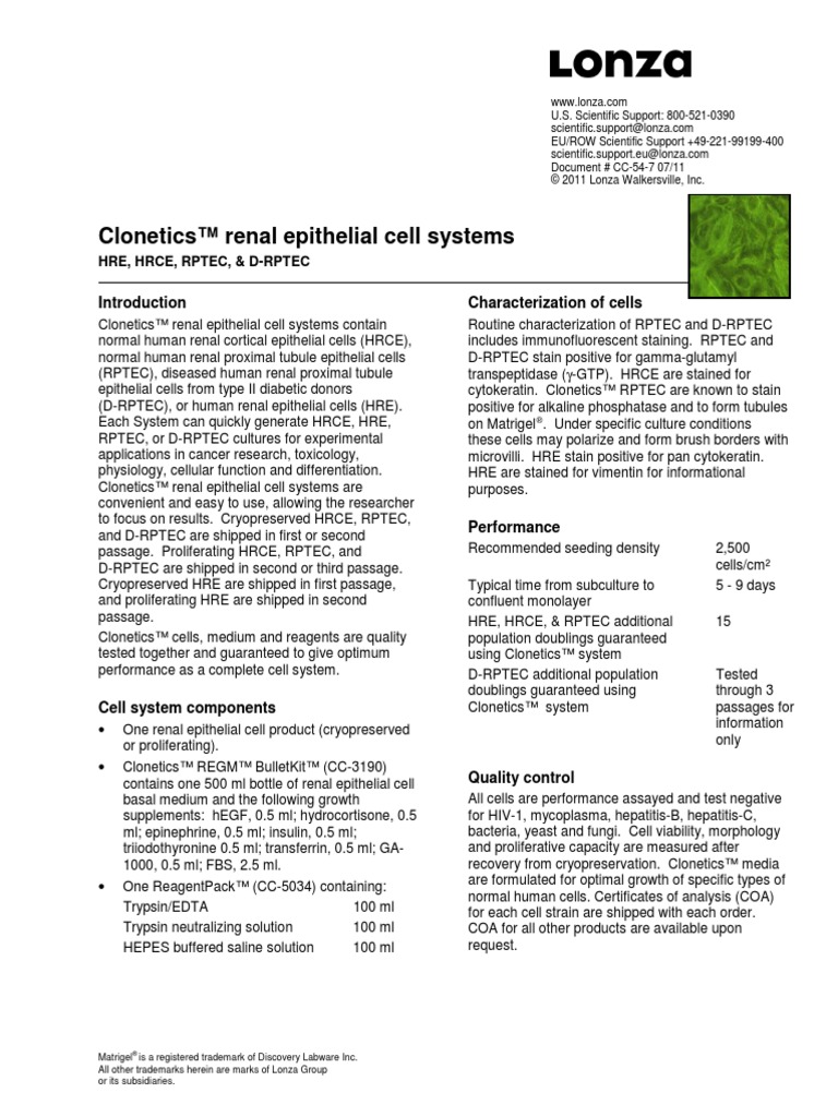 Lonza BenchGuides Renal Epithelial Cell Systems PDF Virus