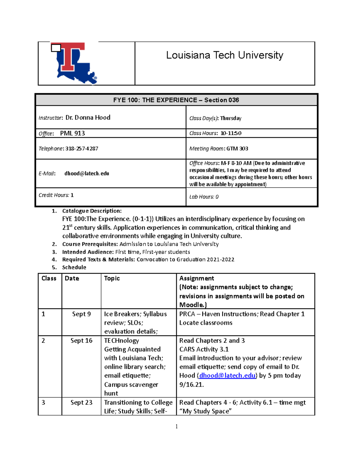 2021 036 FYE 100 Syllabus Louisiana Tech University FYE 100 THE
